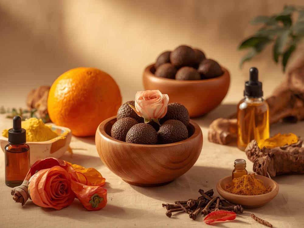- الأعشاب الطبيعية: مثل الكركم والصندل، التي تشتهر بخصائصها المضادة للأكسدة والمفتحة للبشرة.